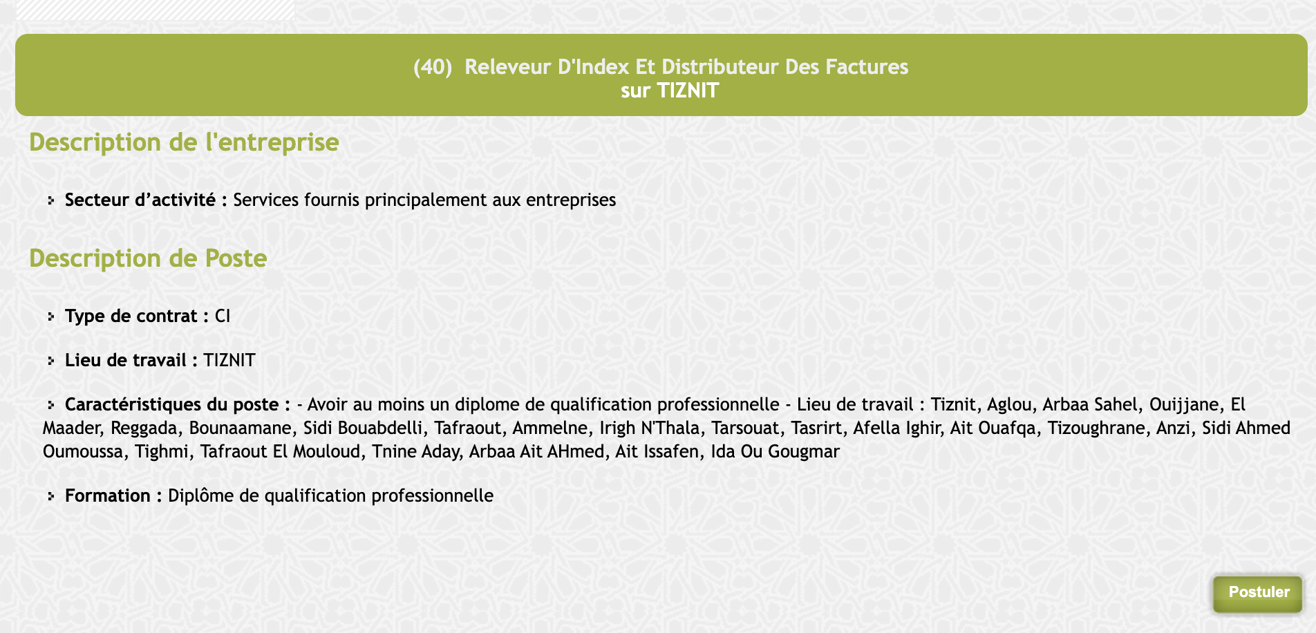 تهم هذه المناصب مهمة قراءة العدادات وتوزيع الفواتير الخاصة بالماء والكهرباء، وهي فرصة مميزة للراغبين في اكتساب تجربة ميدانية في مجال الخدمات العامة بعقد إدماج (Contrat d’Insertion).